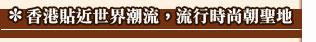作為國際矚目的「購物天堂」,香港絕對能迎合購物愛好者的不同品味,不論名牌高檔、精品小店或是便宜小攤,隨意逛逛就讓你緊貼世界各地時裝及生活潮流脈搏。 有小日本稱號的銅鑼灣、集合了中高檔消費的各式購物商的尖沙咀、油麻地的廟街和玉器市場、旺角的女人街以及名牌精品集散中心中環,都是您到香港時尚朝聖的必逛區域。 |