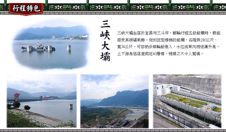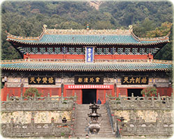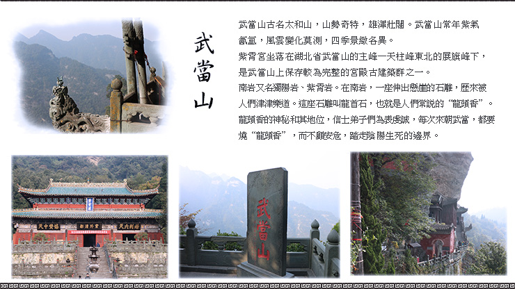 【本日住宿在武當山頂,請團員攜帶1天盥洗衣物上山】 【紫霄宮】坐落在湖北省武當山的主峰-天柱峰東北的展旗峰下。紫霄宮始建於明永樂十一年(1413年),是武當山上保存較為完整的宮殿古建築群之一。自東天門入龍虎殿、循碑亭、十方堂、紫霄殿至父母殿,層層殿堂,依山疊砌,其餘的殿堂樓閣,鱗次櫛比,兩側為東宮、西宮,自成院落,幽靜雅致,再加上四周松柏挺秀,竹林茂密,名花異草,相互掩映,使這片古建築更顯得高貴富麗。 【南岩宮】南岩又名獨陽岩、紫霄岩,明永樂十一年(西元1413 年)重建,有宮殿、道房、亭台等大小房間150間,賜額“大聖南岩宮”,到嘉靖三十一年(西元1552年)擴大到460間。今存石殿,南天門,碑亭,兩儀殿等建築。南岩,又名“紫霄岩”,因它朝向南方,故稱做南岩。在南岩,一座伸出懸崖的石雕,歷來被人們津津樂道。這座石雕叫龍首石,也就是人們常說的“龍頭香”。龍頭香長三米,寬零點五五米,是古代工匠採用圓雕、鏤雕、影雕等多種手法鑿刻的渾為一體的兩條龍。在萬仞峭壁上懸空伸展的兩條龍傳說是玄武大帝的禦騎,玄武大帝經常騎著它們到處巡視。正因為龍頭香的神秘和其地位,信士弟子們為表虔誠,每次來朝武當,都要燒“龍頭香”而不顧安危,踏走陰陽生死的邊界。 【逍遙谷】俗稱獼猴谷。谷中動物種類繁多,時常出沒叢林,出現了“金猴跳澗”、“獼猴獻桃”等奇景,是武當山“動八景”中最有代表性的景點。如今,武當山綠樹成蔭,鳥語花香,獼猴成群。 【太子坡】太子坡古建築群基本上是按照真武修煉的故事來精心設計的,古代建築大師們巧妙地利用山形地勢,建起猶如波浪起伏的夾道牆,被稱九曲黃河牆。進入二道山門,豁然顯出一寬闊院落,漫步走進,只見小院重疊、幽靜雅適,前有依岩而建的“五雲樓”,中有“皇經堂”、“藏經閣”,後有高臺之上的“太子殿”。太子坡整體佈局左右參差、高低錯落、協調而完美,巧妙且富有神秘色彩。置身複真觀的最高處,俯視深壑,曲澗流碧;縱覽群山,千峰竟秀;每逢夕陽西下,還可見武當“太和剪影”的奇觀。