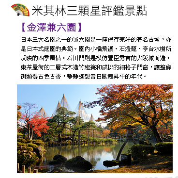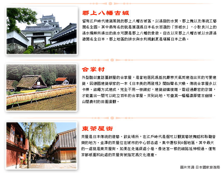 【兼六園】位於石川縣境內正中位置的金澤市,是北陸地區經濟、商業和文化的中心城市,自 16 世紀末期的武將前田利家在此築城以來,持續繁榮了將近300年,是一座保存完好的著名古城。位於金澤市中心,名列《日本三大名園:金澤兼六園、水戶偕樂園、岡山後樂園》之一的兼六園,亦是日本式庭園的典範,1676年由前田利家所建,是江戶時代的築山、林泉、迴遊式庭園代表作,占地約10萬平方公尺。其名引自宋代詩人李格非《洛陽名園記》所述,名園需兼具符合「宏大、幽邃、人力、蒼古、水泉、眺望」等6勝,具有六種好園林的特質,因而被取名為《兼六園》。原本只是金澤城的庭園,後因歷代藩主的多次整建翻修而成為一座迴遊林泉式庭園,園內小橋飛瀑、石燈籠、亭台水榭,若細心觀賞,將可發現庭院中的花草樹木所反映的四季風情,春天的櫻花、夏天的蒼蒲、秋天的楓紅、冬天的松雪,每個季節都有不同的美景。 【金澤城遺址-石川門】位於兼六園對面,是百萬石大名前田家所築。金澤城模仿豐臣秀吉的大阪城而造。壯麗的天守閣在1602年因遭雷擊而焚毀,其後雖然又修造了5層的箭樓,但卻沒有再造天守閣。金澤城後來屢遭火災,特別是1881年的大火,將城內建築幾乎全部燒光。現存的只有城牆和石川門等少數建築。 【金澤東茶屋街】茶屋是日本傳統娛樂飲食場所,在江戶時代是個可以觀賞藝妓舞蹈及聆聽音樂的地方,讓上流社會流漣忘返之地。東茶屋街的特徵是在當時僅有最高級官員家宅邸才能建的二層式木造竹建築和成排的細格子門窗,讓整條街顯得古色古香,靜靜遙想昔日歌舞昇平的年代。東茶屋街以具有歷史價值的茶屋街之姿與京都祇園、主計町茶屋街齊名,同時這?也是五木寬之名著《朱鷺之墓》的背景舞台,為金澤市指定文化財,舊名為東廓,走進東山這狹窄的小巷,立即呈現您眼前的是石板街道、紅柄四方格窗以及具有日本北方強烈色彩傳統建築群;感受漫步於優雅古街中的閒情。 若時間許可,您也可自費前往擁有180多年歷史的【懷華樓或志摩茶屋】參觀並品嚐道地抹茶,享受茶屋的古典氣氛。 【月兔之里】月兔之里的兔子廣場中,約有五十隻超可愛人氣兔子恣意跳躍奔跑。您可自行購買飼料餵食或是自費體驗抱兔子的樂趣;另外,內有玉兔神社,能祈求有良好的人際關係及孩子健康長大,還有玉兔神社專屬的御守,可愛至極。 【湯國之森傳統工藝村】位於山代溫泉鄉,在擁有13萬坪廣闊的大自然森林中,日本古老的傳統建築鱗次櫛比。這些風格各異的古老房屋成為向來訪者介紹日本傳統工藝和加賀文化之建築。這裡不僅能夠親睹即使在日本也很稀罕且價值極高的藝術品,館內更展示著古風味之手工藝品,如金箔館、友禪染織館、輪島漆館和紙館、九谷燒…等,均可看到這些古日本時代保留至今的加賀傳統手工藝品,您可以充分感受誇耀於世界的日本之卓越技術和感性的樂趣。 續專車前往【小松空港】搭乘豪華客機,返回溫暖的家台北,結束此次精緻北陸之旅!
