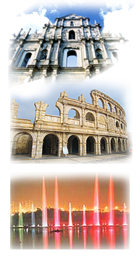 ◇ 大三巴牌坊 是大三巴聖保羅教堂〈〈St. Paul Church〉〉在火災後僅存的大門前壁遺跡。 由大三巴牌坊壁上精緻的浮雕,可以遙想當年聖保羅教堂建築精雕細琢的歐洲文藝復興時期與東方建築風格。 | ◇ 漁人碼頭 澳門首個主題式娛樂景點,位於外港新填海區海岸,全區分為: ﹝唐城﹞仿唐朝建築風格的購物商場。 ﹝東西匯聚﹞訴求東西文化交融,機動遊戲、電子遊戲、動感樂園。 ﹝勵駿碼頭﹞歐陸及拉丁式建築風格的碼頭。 | ◇ 南灣湖激光音樂噴泉 號稱亞洲最大噴泉有120公尺長、中央水柱高 70 公尺,花式噴泉旁設有5000瓦音響設備,還有雷射水幕螢幕。 激光表演期間,南灣湖面上會噴出大型水幕,各種不同線條造型的圖案在水幕上跳動,變幻出動畫、人物、澳門主要名勝、景點、建築物等五十多種圖型,其中有融和門、大三巴牌坊、飛機、恐龍、幾何圖型、跳舞女郎等,在悠揚的樂曲、七彩的燈光及花式噴泉的交織、襯托下,南灣湖畔一帶添上艷麗的色彩。日間的噴泉亦相當可觀,由多個噴嘴噴出的低矮水花及一百米高的水柱,在音樂的配合,營造出活力、動感的效果。 |