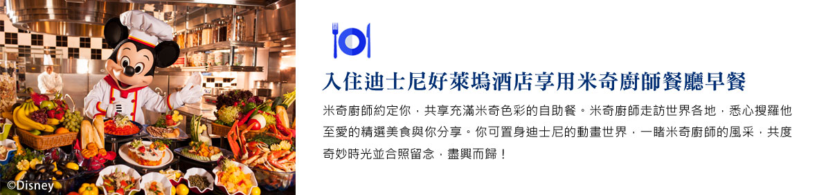 【尊龍禮遇】米奇廚師餐廳饗宴,與米奇廚師共進早餐、 歡樂合照,享受美好用餐時光。