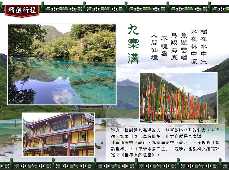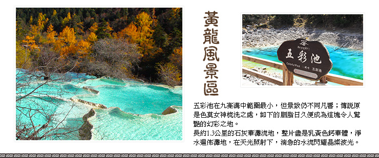 【九寨溝-日則溝景區】 珍珠灘瀑布:呈新月狀,猶如一面巨大晶瑩的珠幕,從陡峭的斷層垂掛而下,置身其間,真有"滾滾銀花足下踩,萬頃珍珠涌入懷"的感覺。 五花海:九寨溝的驕傲。同一水域,卻呈現出鵝黃、墨綠、深藍、藏青等色澤,在陽光的照射下,斑駁迷離,非常奇妙。五花海有著"九寨精華"及"九寨一絕"的美名,站在五花海最高點老虎石上俯視,可一覽五花海全景。 熊貓海瀑布:三級疊水,極為壯觀,九寨溝落差最大的瀑布。隆冬時節,飛流結為冰瀑,儼然一派璀璨耀眼的冰晶世界。 箭竹海:和熊貓海是一對姐妹海,海水澄明,箭竹吐翠,柔情嫵媚,婀娜多姿。 【九寨溝-樹正溝景區】 盆景灘:在荷葉寨前方,該處是一個地勢低平的淺灘,整個景點猶如一座多姿多彩的巨大盆景。蘆葦海:是一個半沼澤湖泊,海中蘆葦叢生,水鳥飛翔,微風撫過,颯颯有聲,令人心曠神怡。 火花海:神奇莫測,風吹浪生,顯出朵朵"火花",金光燦燦,但此景多出現在清晨日出時分。 樹正瀑布:在樹正寨附近,是九寨溝內第一個瀑布群,數十個海子綿延7公里,形成多層台階,一道道瀑布穿掠其間。只見群海之間,群瀑飛瀉,蔚為奇觀。 犀牛海:是樹正溝內最大的海子,是景色變化最多的海子,水面湛藍,倒影似幻似真,與天地、樹林渾然一體。 諾日郎瀑布:景區的心臟部位,常作為九寨溝的標誌和象徵。雄偉壯觀的瀑布是旅客們最鐘愛的取景點之一。 【九寨溝-則查窪溝景區】 季節海:湖水隨季節變化時盈時涸,秋日水豐,湖色湛藍;夏日水淺,湖色翠綠;初冬過後,湖水乾涸;春季遍佈青草,成了天然的放牧草灘。五彩池:池水上半部呈碧藍色,下半部則呈橙紅色,色彩斑斕,小巧玲瓏,與日則溝的五花海不相上下。 長海:是九寨溝內最大的海子。它沒有出水口,排水靠蒸發和地下滲透。夏秋縱遇暴雨,海水也不溢堤,冬春久旱無雨,海水也不乾涸。藏胞讚美它是"裝不滿、漏不干的寶葫蘆"。