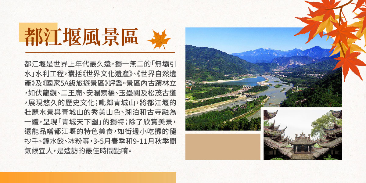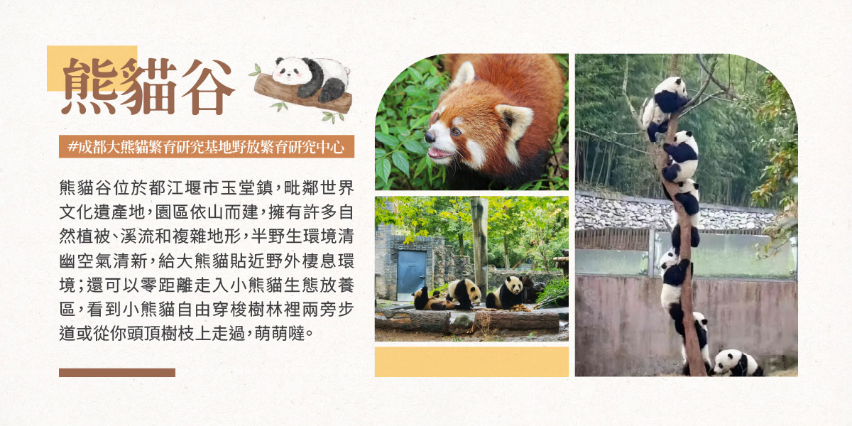 飯店→【熊貓谷】零距離走入大熊貓棲息環境與小熊貓生態放養區,享受一段沈浸式自然之旅→榮獲世界文化遺產、世界自然遺產及國家5A級旅遊景區評鑑【都江堰風景區(含電瓶車體輕鬆賞遊)】→【仰天窩廣埸】網紅打卡熱點:世界第一座大型《自拍熊貓》藝術雕塑→都江堰融創綜合文旅渡假城→酒店