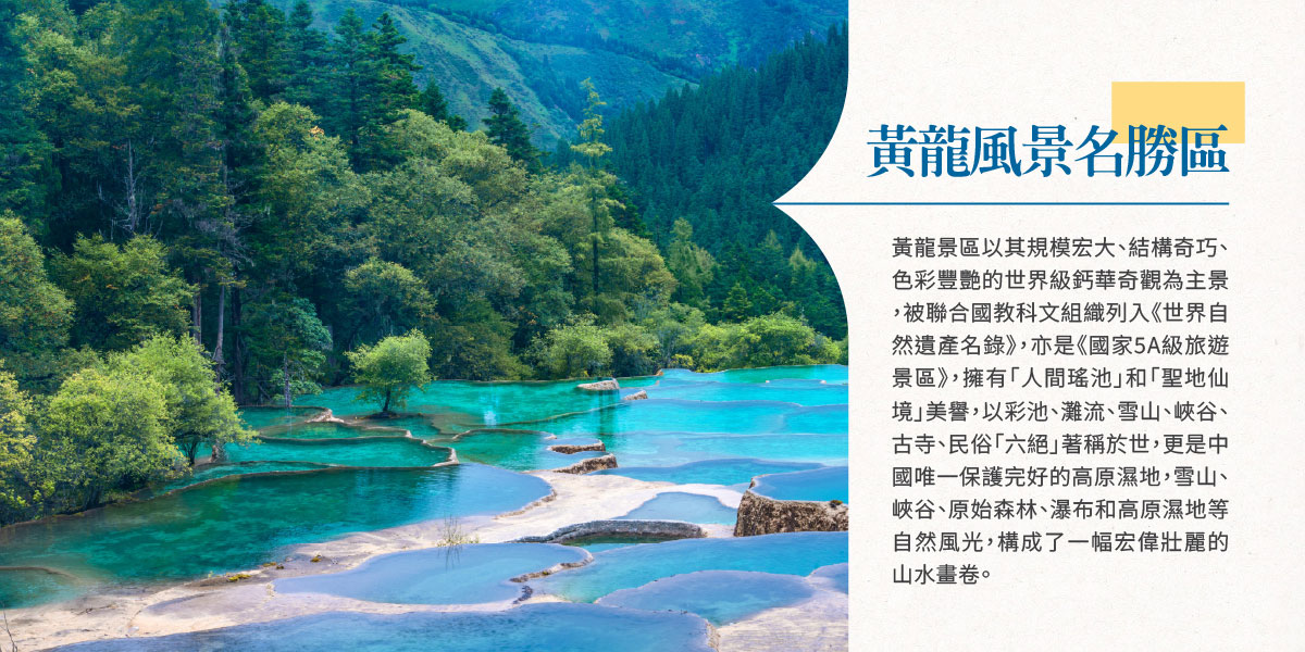 飯店→擁「人間瑤池」美譽,巨型鈣華岩溶景觀是世界規模最大,保存最完好的喀斯特地貌【黃龍風景名勝區】(含上行纜車、電瓶車輕鬆賞遊)→高鐵站(搭乘一等座)→飯店(成都)