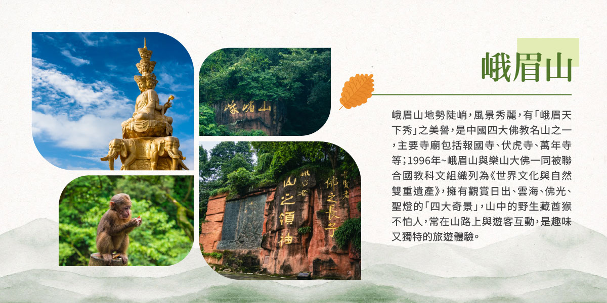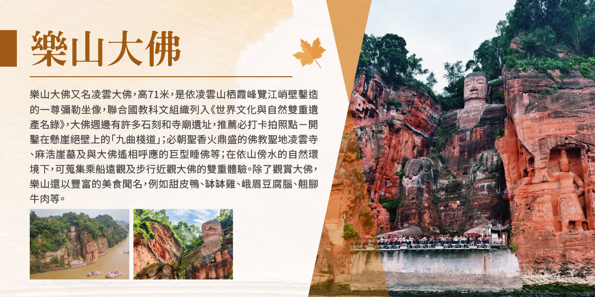 飯店→石刻藝術的傑作-世界上高度最高石佛像【樂山大佛】,特別安排遊船仰望大佛的巍峨壯嚴→飯店(峨嵋山)