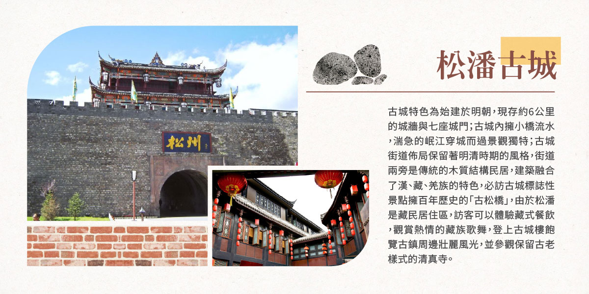 飯店→世界上最完整的地震遺跡之一【疊溪海子】→「川西門戶」松潘古城,遊覽明代青磚古城牆暨城門、百年歷史古松橋及感受文化底蘊深厚的藏族風情→飯店(九寨溝)
