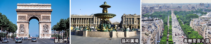 舉世聞名的巴黎香榭麗舍大道,長長的林蔭道綿延寬闊,起於凱旋門,直達遠方的協和廣場之方尖碑;漫步於此,一望無際的開放視野,帶來心曠神怡的感官享受。大道後半段是花木繁茂的繽紛花園,匯聚凱旋門、協和廣場、大小皇宮及法國總統府艾麗榭宮,沿路景點洋溢濃濃的文藝復興風,教人陶醉在中古法國的浪漫氛圍。而盡頭處壯麗的凱旋門,不僅是巴黎都會藝術精神象徵,更完整展現法國藝術之美學,拱狀城樓以白色大理石建造,壯觀氣派;四面牆上的浮雕,以拿破崙功績為主題,一幅幅雕工精細、栩栩如生,讓人彷彿親臨戰事現場,感受昔日霸主的豪氣萬千;登上樓頂的展望台,還可眺望巴黎街景、艾菲爾鐵塔等,好似畫卷般的景色,直教人流連忘返。