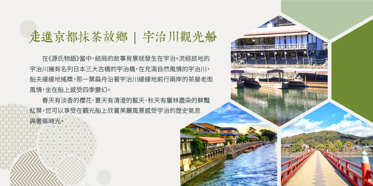 【宇治川觀光船】搭乘宇治川觀光船,感受四季變幻。春天可以欣賞到芬芳的櫻花,夏天可以欣賞到湛藍的天空和翠綠的樹木,秋天可以欣賞到色彩繽紛的紅葉,您可以享受在觀光船上欣賞美麗風景的奢華時光。