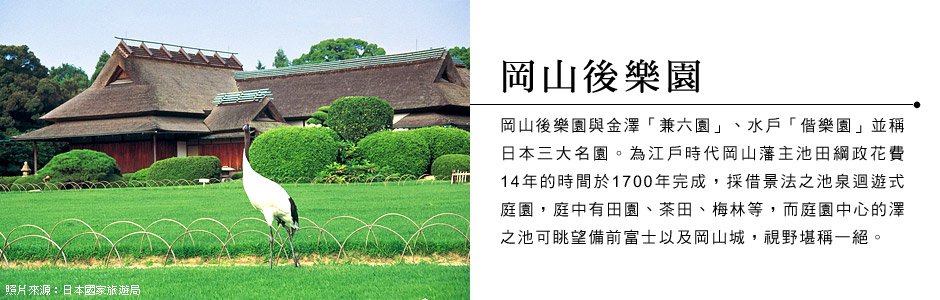 【岡山後樂園】已被列聯合國教科文組織的世界文化遺跡日本三大名園之一的觀光名所,後樂園與金澤『兼六園』、水戶『偕樂園』並稱日本三大名園。佔地十三萬平方公尺,為江戶時代岡山藩主池田綱政花費14年的時間於1700年完成,採借景法之池泉迴遊式庭園,整體的設計不僅只於鑑賞的功能也有修身、待客、武術鍛鍊等用途,庭中有田園、茶田、梅林等,而庭園中心的澤之池可眺望備前富士以及岡山城,視野堪稱一絕。
