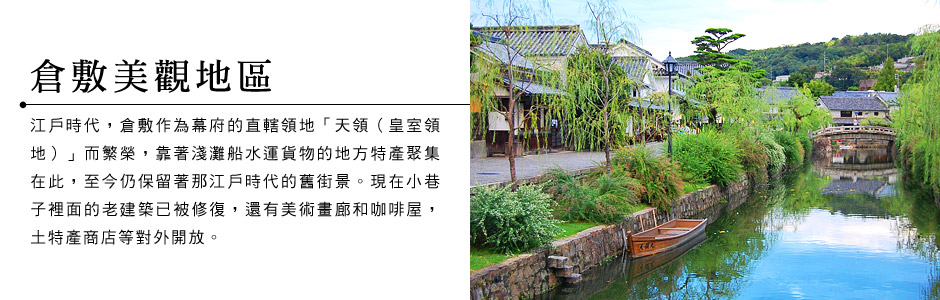 【倉敷美觀地區】保存著日本江戶時期直轄地盛極一時的繁榮情景,一街一景都有著樸實的風味。流過整個倉敷美觀地區的倉敷川是1條由石垣砌成的河道,其中有10座青石拱橋跨越兩岸。兩岸儘是看不盡的楊柳與櫻花。漫步在古意盎然的純樸街道中,沿途可以欣賞商人們用於貯存貨物的白色牆壁的倉庫,至今尚保存著的貨場、大八車(過去運送物資的車)通行的石板路、相當於古時的路燈的常明燈等等,反映出當時的繁榮景象。19世紀下半葉,倉敷的商人開始積極吸收西洋文化,被視為倉敷文化象徵、擁有希臘風格的大原美術館就建於1930年。