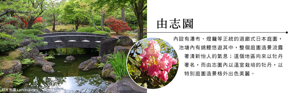 【由志園】設有瀑布、燈籠等正統的迴廊式日本庭園,池塘內有錦鯉悠遊其中,整個庭園造景流露著清新怡人的氣息;這個地區向來以牡丹著名,而由志園內以溫室栽培的牡丹,以特別庭園造景格外出色美麗。