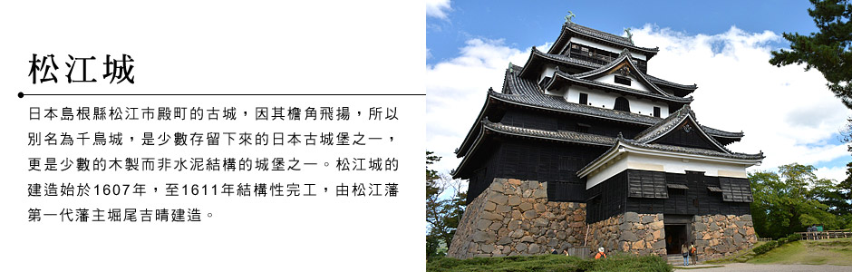 【松江城】是日本島根縣松江市殿町的古城。因其檐角飛揚,所以別名為千鳥城,是少數存留下來的日本古城堡之一,更是少數的木製而非水泥結構的城堡之一。松江城的建造始於1607年,至1611年(慶長16年)結構性完工,由松江藩第一代藩主堀尾吉晴建造。1638年松江城與其封地被授予德川幕府的下屬松平氏。