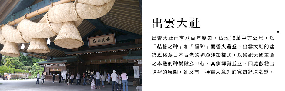 【出雲大社】已有八百年歷史,佔地18萬平方公尺,以「結緣之神」和「福神」而香火鼎盛。出雲大社的建築風格為日本古老的神殿建築樣式,以祭祀大國主命之本殿的神樂殿為中心,其側拜殿並立,四處散發出神聖的氛圍,卻又有一種讓人意外的寬闊舒適之感。