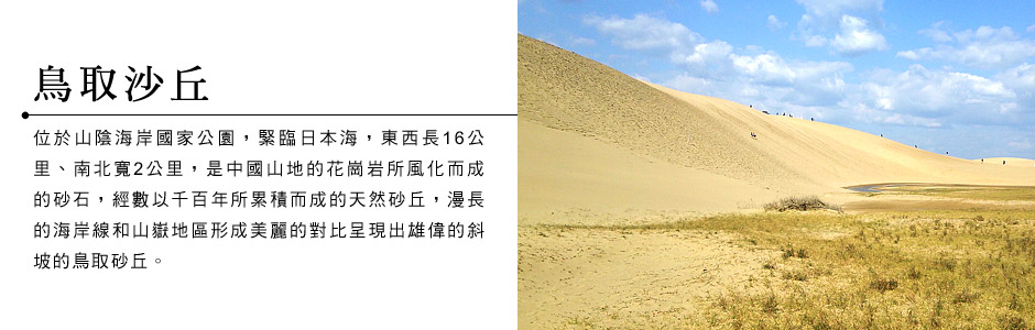 【鳥取砂丘】是位於山陰海岸國家公園,緊臨日本海,東西長16公里、南北寬2公里,是中國山地的花崗岩所風化而成的砂石,經數以千百年所累積而成的天然砂丘,漫長的海岸線和山嶽地區形成美麗的對呈現出雄偉的斜坡的鳥取砂丘如您有興趣可自費與沙漠中的駱駝照像留下紀念喔。