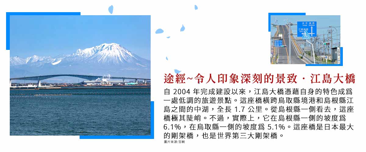 【江島大橋】自 2004 年完成建設以來,江島大橋憑藉自身的特色成為一處低調的旅遊景點。這座橋橫跨鳥取縣境港和島根縣江島之間的中湖,全長 1.7 公里。從島根縣一側看去,這座橋極其陡峭。不過,實際上,它在島根縣一側的坡度為 6.1%,在鳥取縣一側的坡度為 5.1%。這座橋是日本最大的剛架橋,也是世界第三大剛架橋。