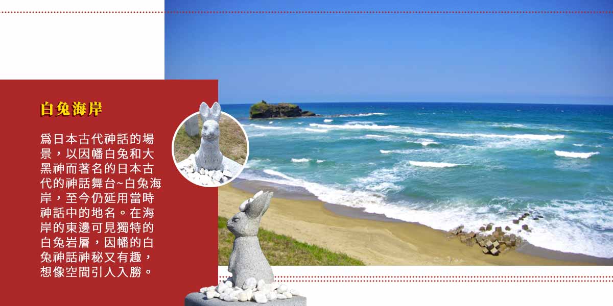 【白兔海岸】為日本古代神話的場景,以因幡白兔和大黑神而著名的日本古代的神話舞台~白兔海岸,至今仍延用當時神話中的地名。在海岸的東邊可見獨特的白兔岩層,因幡的白兔神話神秘又有趣,想像空間引人入勝。
