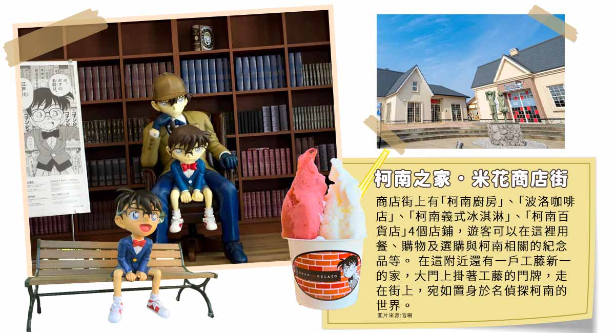 【柯南之家~米花商店街】商店街上有「柯南廚房」、「波洛咖啡店」、「柯南義式冰淇淋」、「柯南百貨店」4個店鋪,遊客可以在這裡用餐、購物及選購與柯南相關的紀念品等。 在這附近還有一戶工藤新一的家,大門上掛著工藤的門牌,走在街上,宛如置身於名偵探柯南的世界。