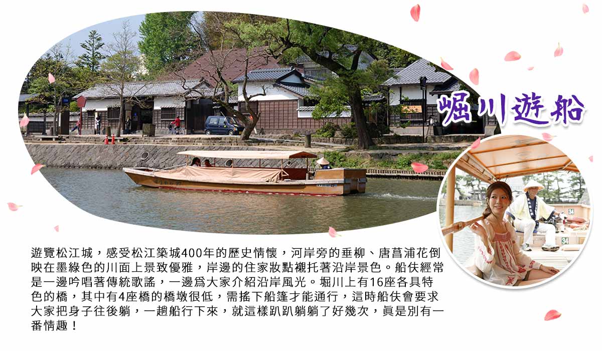 搭乘堀川遊船遊覽松江城,感受松江築城400年的歷史情懷,河岸旁的垂柳、唐菖浦花倒映在墨綠色的川面上景致優雅,岸邊的住家妝點襯托著沿岸景色。船伕經常是一邊吟唱著傳統歌謠,一邊為大家介紹沿岸風光。堀川上有16座各具特色的橋,其中有4座橋的橋墩很低,需搖下船篷才能通行,這時船伕會要求大家把身子往後躺,一趟船行下來,就這樣趴趴躺躺了好幾次,真是別有一番情趣!