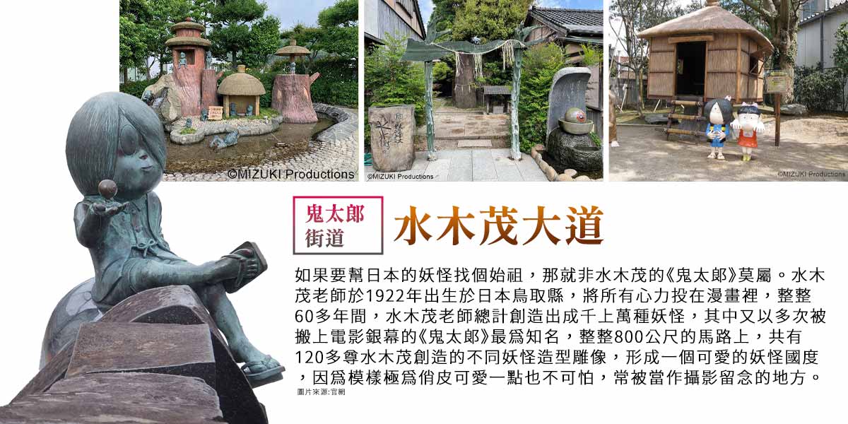 【鬼太郎街道~水木茂大道】如果要幫日本的妖怪找個始祖,那就非水木茂的《鬼太郎》莫屬。水木茂老師於1922年出生於日本鳥取縣,將所有心力投在漫畫裡,整整60多年間,水木茂老師總計創造出成千上萬種妖怪,其中又以多次被搬上電影銀幕的《鬼太郎》最為知名,整整800公尺的馬路上,共有120多尊水木茂創造的不同妖怪造型雕像,形成一個可愛的妖怪國度,因為模樣極為俏皮可愛一點也不可怕,常被當作攝影留念的地方。