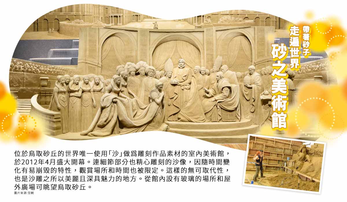 【砂之美術館】位於鳥取砂丘的世界唯一使用「沙」做為雕刻作品素材的室內美術館,於2012年4月盛大開幕。連細節部分也精心雕刻的沙像,因隨時間變化有易崩毀的特性,觀賞場所和時間也被限定。這樣的無可取代性,也是沙雕之所以美麗且深具魅力的地方。從館內設有玻璃的場所和屋外廣場可眺望鳥取砂丘。