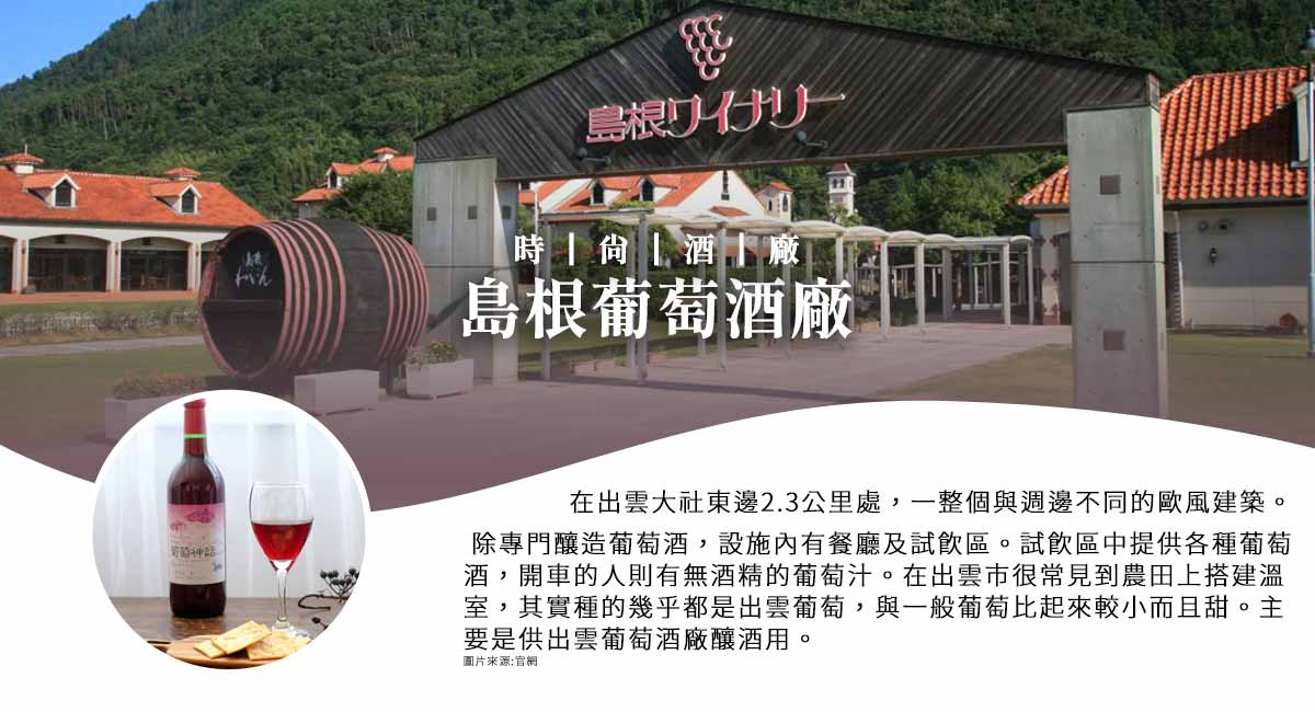 除專門釀造葡萄酒,設施內有餐廳及試飲區。試飲區中提供各種葡萄酒,開車的人則有無酒精的葡萄汁。在出雲市很常見到農田上搭建溫室,其實種的幾乎都是出雲葡萄,與一般葡萄比起來較小而且甜。主要是供出雲葡萄酒廠釀酒用。