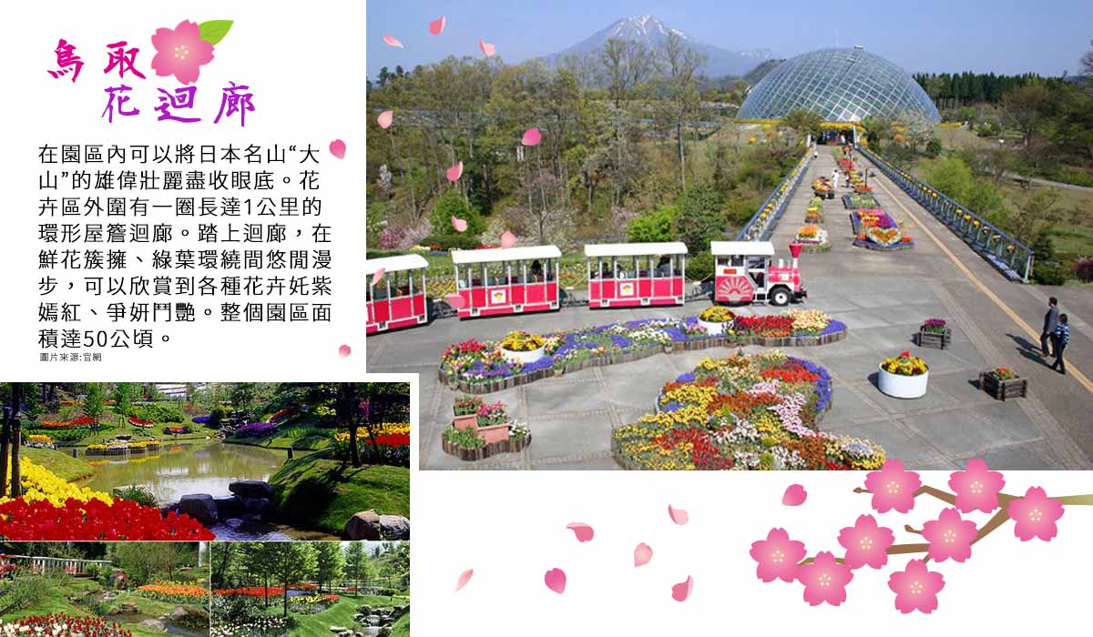 【鳥取花迴廊】日本最大級別的花卉主題公園之一,在園區內可以將日本名山“大山”的雄偉壯麗盡收眼底。花卉區外圍有一圈長達1公里的環形屋簷迴廊。踏上迴廊,在鮮花簇擁、綠葉環繞間悠閒漫步,可以欣賞到各種花卉奼紫嫣紅、爭妍鬥艷。整個園區面積達50公頃。