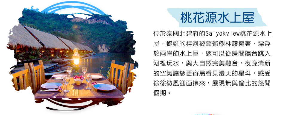 住宿:桂河Saiyokview桃花源水上屋(真正推窗見水)或同級