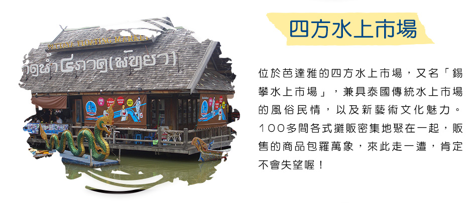 結合農村文化藝術元素,融合鄉村文化木雕。風格的複合式水上市場,佔地3680平方公尺。各種泰式水上建築在迂迴的河道上,穿梭在水上五金商貨水果雜項商家。或有民俗傳統舞蹈笙歌,木雕藝術敲打聲;好棒的巧思,把泰國傳統文化展現的是如此多嬌。