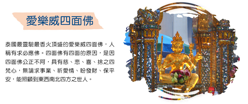 東南亞極富盛名的四面佛,是印度婆羅門教的主神、泰國各地的主要信仰,祭拜時用鮮花、香燭和木象,也有幾名少女在神前跳傳統的祭神舞,以回謝神願。無論是求財或婚姻都很靈驗,也是港台明星們的最愛。神像全身金碧輝煌,四面佛四個面,象徵四種不同的意義:正面求平安.福慧 ( 慈 )、左面保生意.事業 ( 悲 )、右面祈發財.富貴 ( 喜 )後面盼愛情.婚姻 ( 捨 )