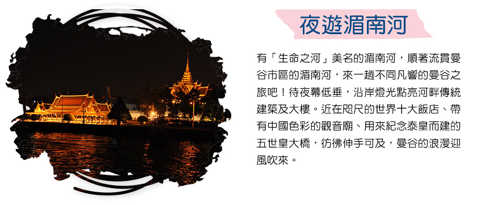 有「生命之河」美名的湄南河,在泰國當地稱為「昭拍耶河」。搭上造價2000多萬的「璀璨之星 時尚遊艇」,順著流貫曼谷市區的湄南河,滑過百年東方與世界各大知名酒店,浪漫中透著些許歲月滄桑。燈光.音樂.賞東方威尼斯夜景,說不出的愜意。您可以一邊用餐一邊欣賞沿岸的燦爛夜景。