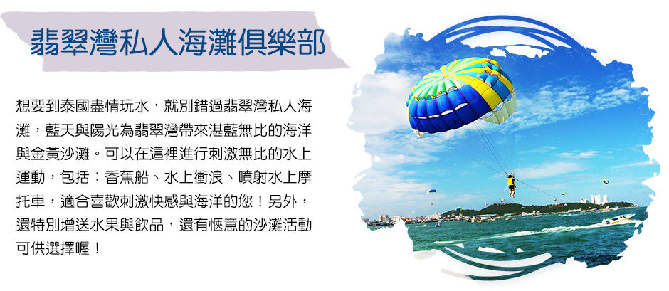 第 2 天    芭達雅→(新翡翠灣)黃金海岸人魚灣私人海灘俱樂部23合1★每人限玩乙次,且不得轉讓:水上摩托車、香蕉船、水上衝浪板。酟心服務:當季水果(兩人一份).清涼椰子(每人一顆)及冰毛巾(每人一次)(不玩三項海上活動可換沙灘腳底按摩30分)★不限次數:獨木舟、橡皮艇、STAND UP PADDLE、漂浮床、划浪板、可樂圈、海上溜滑梯、海上陀螺、海上跳跳床、海上翹翹板。陸上活動,沙灘活動樂翻天:躺椅、沙灘足球、沙灘排球、沙灘飛盤、休閒棋奕、沙灘麻將、FREE WIFI、… **島上設施以實際提供為主**→四方水上市場→飛機!巴黎鐵塔都搬進商場裡2018.10月最新開幕Terminal 21芭達雅航站百貨商城