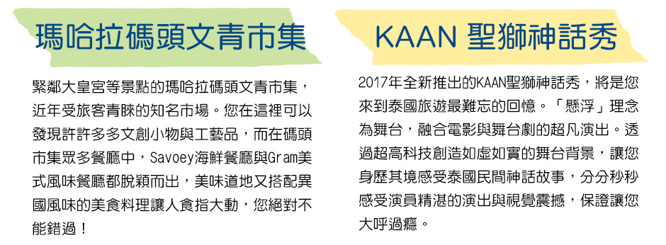 ●第三站:KHAO SAN拷山路?世界唯一藍色星巴克拷山路就像是世界各地的背包客在曼谷所佔據的另一個城市,除了攤販之外,幾乎看到的都是外國人!這裡的酒吧文化非常多元,有LIVE演唱、舞廳PUB、露天啤酒吧,沒有規定要穿得多正視,一切就是隨興,享受只屬於拷山路的自由與放縱!除了酒吧以外,琳瑯滿目的小吃攤販也是一大特色,泰式小吃、水果切、香蕉煎餅…等等,一路走下來讓你飽到不行!來到拷山路還有一個重點,尋找藍色星巴克,這間據說是目前世界唯一整棟以寶藍色調為外觀的星巴克,建築物本身也是仿泰式古建築設計,從地板仿古花磚、復古吊燈、圓拱形狀建築內哩,延伸至窗花、玻璃紋路和桌椅樣式,宛如進入時光隧道。在旅行城市中尋找星巴克,往往會帶給旅人不同的驚喜!拷山路讓人有悠閒的感覺,有歡樂的氣氛,有歷史文化的薰陶,這裡真的是個會讓人忘記煩惱的天堂!※註:行程如遇塞車等路況問題時,為避免影響行程安排而且為維護旅遊品質,將會斟酌調整嘟嘟車上車地點,造成不便之處,敬請見諒。※註:嘟嘟車將安排2~3人乘坐一台車,如您覺得司機服務良好,建議給予小費100泰銖(一台車),以表示鼓勵。