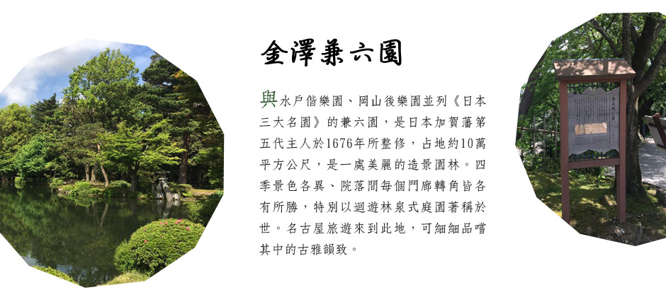 日本三大名園之首,與岡山後樂園、水戶階樂園齊名,亦是日本式庭園的典範。名為兼六,因園中兼具有《宏大、幽邃、人力、蒼古、水泉、眺望》等六大優點而著名;園中古代風格的造景,為庭園景緻之極至。內有列入金氏紀錄的日本最古老噴泉。